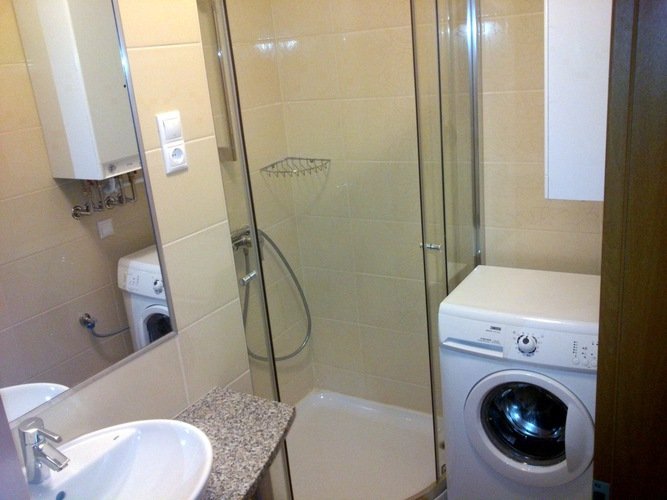 - ванная комната с душем, фен, полотенца, стиральная машина.